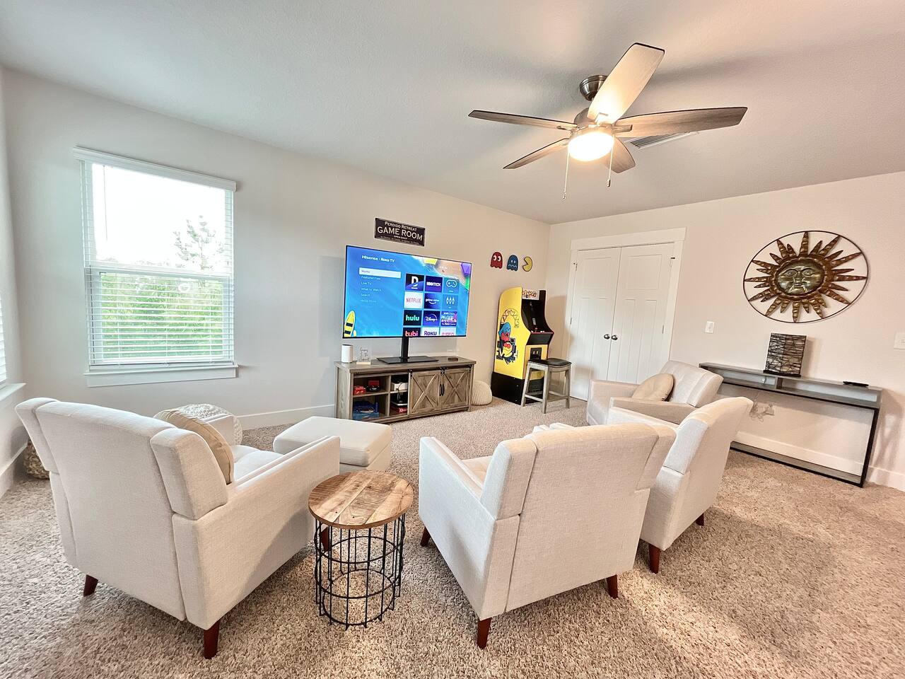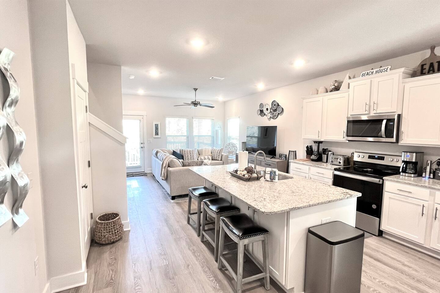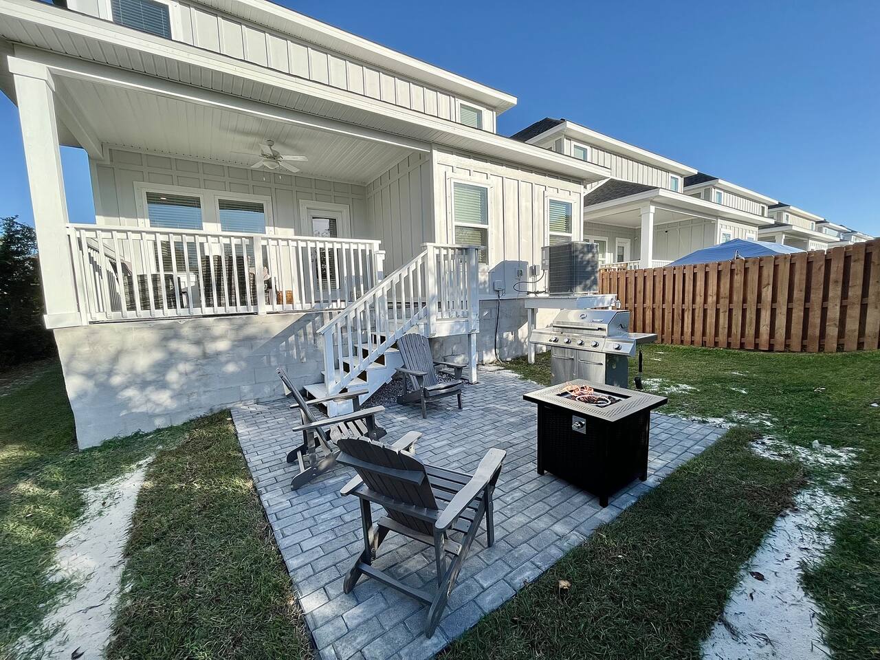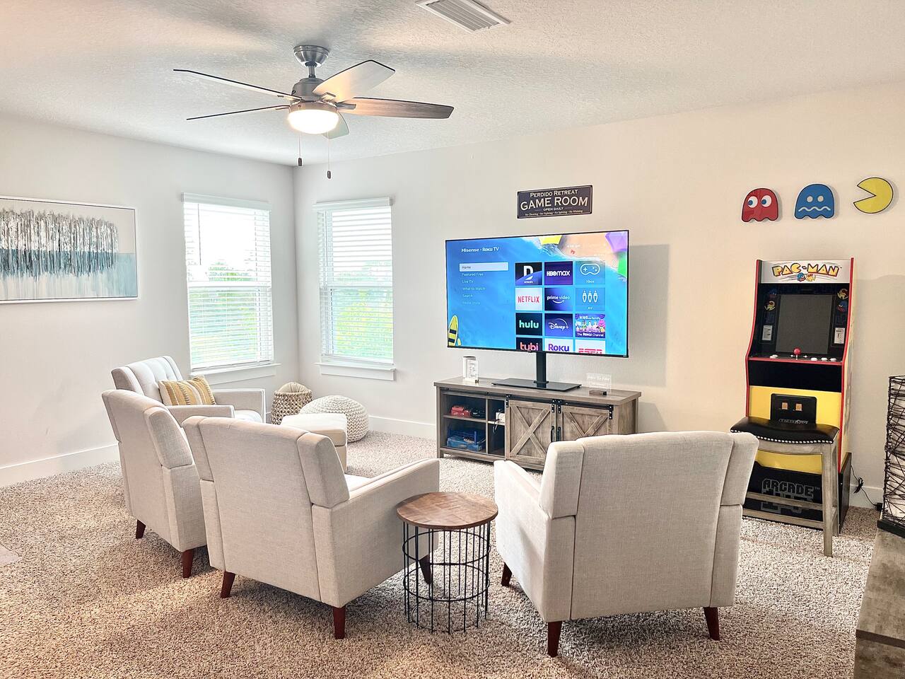 As soon as you enter this luxurious home, you are welcomed by a contemporary open-plan living area, designed and furnished with numerous modern amenities throughout this stylish home. The fully-equipped kitchen connects to the inviting living room, creating a perfect setting for memorable evenings. Ample natural light from the large windows makes the entire home welcoming and relaxing throughout the day. But the best is yet to come. When you're ready to rest and unwind, head to the comfortable bedrooms, designed for resort-style comfort, perfect for recharging after an exciting day enjoying the sun and the stunning beaches of the Emerald Coast. β LIVING ROOM β The living room immediately feels welcoming, with a comfortable sectional sofa and a coffee table that has an adjustable top for drinks and snacks. The 65β Ultra 4K smart TV makes it perfect for family movie nights! β 65β Ultra 4K Smart TV with DirecTV Stream and HBO Max included β Stylish, Adjustable Coffee Table β Access to the Private Porch β KITCHEN & DINING β The kitchen features modern appliances and is ideal for preparing anything from a simple breakfast and quick snack to a romantic three-course dinner. Spacious granite countertops and a central kitchen island offer ample space for culinary creativity. For coffee lovers, a designated coffee bar is available, stocked with dark and medium-roast Starbucks coffees. β Microwave / Electric Stove β Modern Refrigerator/Freezer β Keurig Coffee Maker and Cuisinart Drip Coffee Maker with Starbucks Coffees Serve your delicious meals at the kitchen island or in the dedicated dining room next to the kitchen if you choose to stay in and enjoy a home-cooked meal. β Kitchen Island with Bar Stools β Separate Dining Room with Modern Bar-Height Dining Table β GAMEROOM β The Gameroom is an ideal spot to enjoy quality time with family. It features a 65β Ultra 4K Smart TV, an XBOX game console with Ultimate Gamepass, and a classic Pac-Man arcade machine for entertainment. Additionally, there's a dedicated office area equipped with a desk, computer monitor, and wireless keyboard and mouse. β 65β Ultra 4K Smart TV with DirecTV Stream and HBO Max β XBOX with Two Game Controllers and Access to Ultimate Gamepass β Pac-Man Arcade Machine with a Choice of Classic Arcade Games β Corner Desk with 27β Computer Monitor, Wireless Keyboard, and Mouse β BEDROOMS β The home includes four tastefully decorated bedrooms, with TWO master suitesβone on the main level and another on the second floor. Both master bedrooms have king-size beds and private ensuite bathrooms. Each bedroom is furnished with luxury bedding to ensure a comfortable, relaxing stay after a fun day at the beach. β King Bed in Master on Main Floor β King and Queen Beds in Upstairs Bedrooms β 43β Ultra 4K Smart TVs in Every Bedroom, with DirectTV Stream and HBO Max Included β Spacious Closets with Custom Shelves and Luggage Racks β Ensuite Bathrooms in Two Master Bedrooms - Main Floor and Second Floor β BATHROOMS β Relax in the welcoming full bathrooms equipped with plush towels and all the necessary amenities for your comfort and convenience. β PORCH AND PATIO β Step outside to the private rear porch and enjoy stunning sunsets with your family, while taking in the tranquil view. The fenced backyard, equipped with a gas grill and fire pit, is ideal for relaxing after a fun day at the beach. We also provide complimentary beach gear and bicycles for your enjoyment and convenience! We look forward to welcoming you and your family to Perdido Retreat!