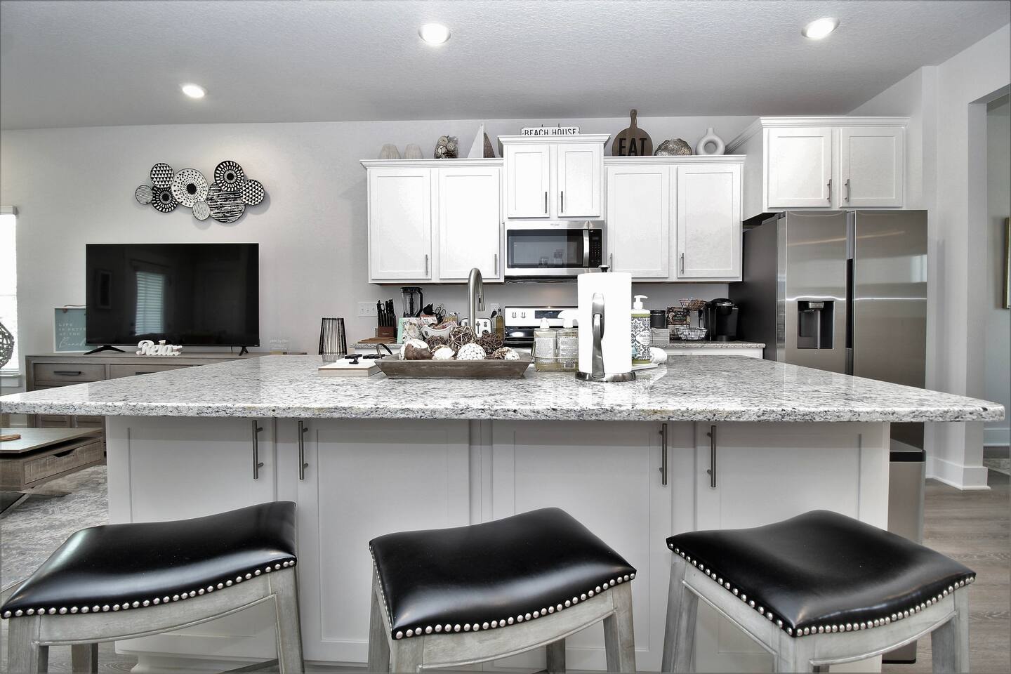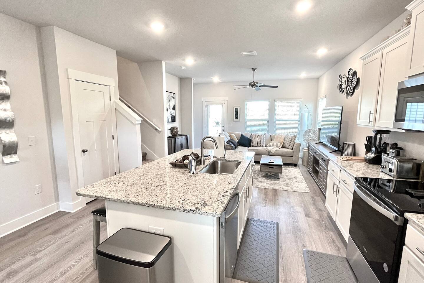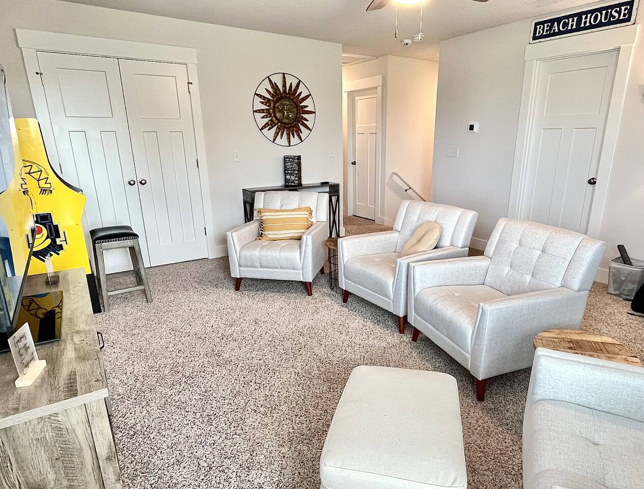 As soon as you enter this luxurious home, you are welcomed by a contemporary open-plan living area, designed and furnished with numerous modern amenities throughout this stylish home. The fully-equipped kitchen connects to the inviting living room, creating a perfect setting for memorable evenings. Ample natural light from the large windows makes the entire home welcoming and relaxing throughout the day. But the best is yet to come. When you're ready to rest and unwind, head to the comfortable bedrooms, designed for resort-style comfort, perfect for recharging after an exciting day enjoying the sun and the stunning beaches of the Emerald Coast. β LIVING ROOM β The living room immediately feels welcoming, with a comfortable sectional sofa and a coffee table that has an adjustable top for drinks and snacks. The 65β Ultra 4K smart TV makes it perfect for family movie nights! β 65β Ultra 4K Smart TV with DirecTV Stream and HBO Max included β Stylish, Adjustable Coffee Table β Access to the Private Porch β KITCHEN & DINING β The kitchen features modern appliances and is ideal for preparing anything from a simple breakfast and quick snack to a romantic three-course dinner. Spacious granite countertops and a central kitchen island offer ample space for culinary creativity. For coffee lovers, a designated coffee bar is available, stocked with dark and medium-roast Starbucks coffees. β Microwave / Electric Stove β Modern Refrigerator/Freezer β Keurig Coffee Maker and Cuisinart Drip Coffee Maker with Starbucks Coffees Serve your delicious meals at the kitchen island or in the dedicated dining room next to the kitchen if you choose to stay in and enjoy a home-cooked meal. β Kitchen Island with Bar Stools β Separate Dining Room with Modern Bar-Height Dining Table β GAMEROOM β The Gameroom is an ideal spot to enjoy quality time with family. It features a 65β Ultra 4K Smart TV, an XBOX game console with Ultimate Gamepass, and a classic Pac-Man arcade machine for entertainment. Additionally, there's a dedicated office area equipped with a desk, computer monitor, and wireless keyboard and mouse. β 65β Ultra 4K Smart TV with DirecTV Stream and HBO Max β XBOX with Two Game Controllers and Access to Ultimate Gamepass β Pac-Man Arcade Machine with a Choice of Classic Arcade Games β Corner Desk with 27β Computer Monitor, Wireless Keyboard, and Mouse β BEDROOMS β The home includes four tastefully decorated bedrooms, with TWO master suitesβone on the main level and another on the second floor. Both master bedrooms have king-size beds and private ensuite bathrooms. Each bedroom is furnished with luxury bedding to ensure a comfortable, relaxing stay after a fun day at the beach. β King Bed in Master on Main Floor β King and Queen Beds in Upstairs Bedrooms β 43β Ultra 4K Smart TVs in Every Bedroom, with DirectTV Stream and HBO Max Included β Spacious Closets with Custom Shelves and Luggage Racks β Ensuite Bathrooms in Two Master Bedrooms - Main Floor and Second Floor β BATHROOMS β Relax in the welcoming full bathrooms equipped with plush towels and all the necessary amenities for your comfort and convenience. β PORCH AND PATIO β Step outside to the private rear porch and enjoy stunning sunsets with your family, while taking in the tranquil view. The fenced backyard, equipped with a gas grill and fire pit, is ideal for relaxing after a fun day at the beach. We also provide complimentary beach gear and bicycles for your enjoyment and convenience! We look forward to welcoming you and your family to Perdido Retreat!
